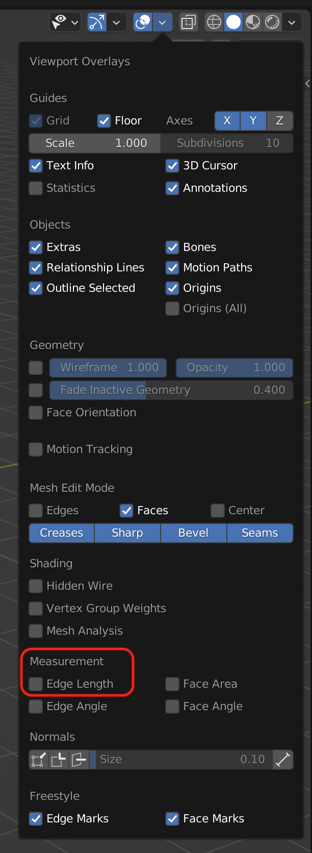 Edit Mode, Overlays Menu, Measurement: Edge Length Hint: You can add these options to the Q Quick menu, to toggle them quickly within edit mode. |