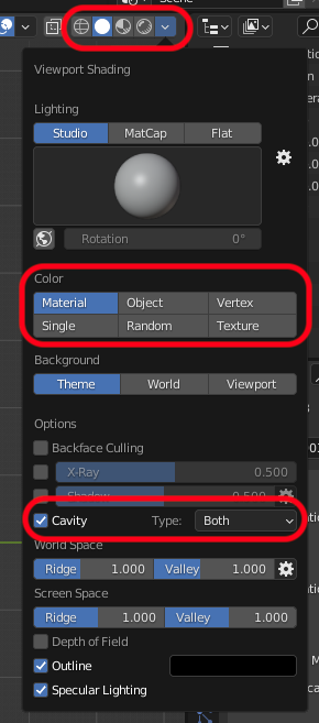 Viewport shading options: Color: Random Cavity: Type: Both |