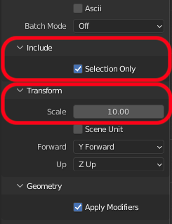 When exporting as STL chose selected object, then File > Export > STL select Selection Only and Scale to 10. |