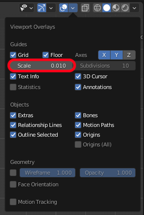 Then under Viewport Overlays set Scale to 0.01, this makes the default Blender cube an 20x20mm object and draws grid lines every millimeter. |